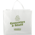 The Double Laminated Wipeable Jumbo Tote is the largest tote at PCNA and is perfect for catering or any other large items. The double lamination makes both the interior and exterior easily wipeable to protect against germs. This tote has double handles, an open main compartment, and a supportive plastic bottom board. Product dimensions are 18"H x 21"W x 12.5"D