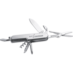 The 8-Function Stainless Steel Knife includes a knife, nail file, scissors, can opener, bottle opener/flat-head screwdriver, a Phillips-head screwdriver, a corkscrew and a mini metal split key ring.